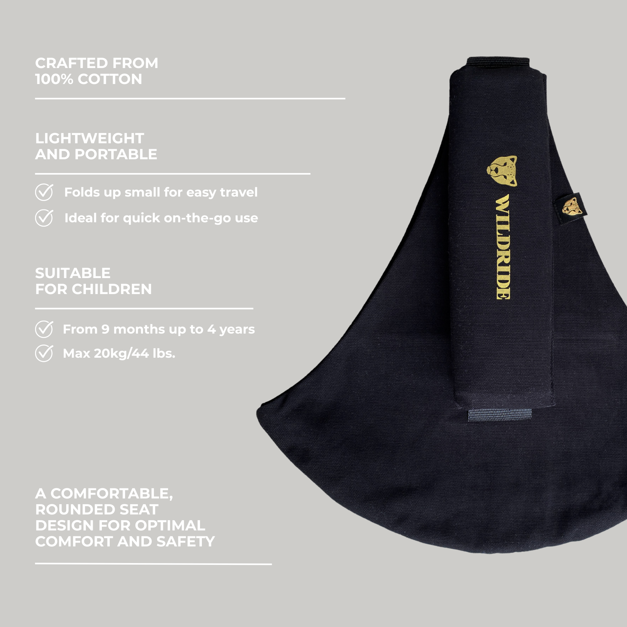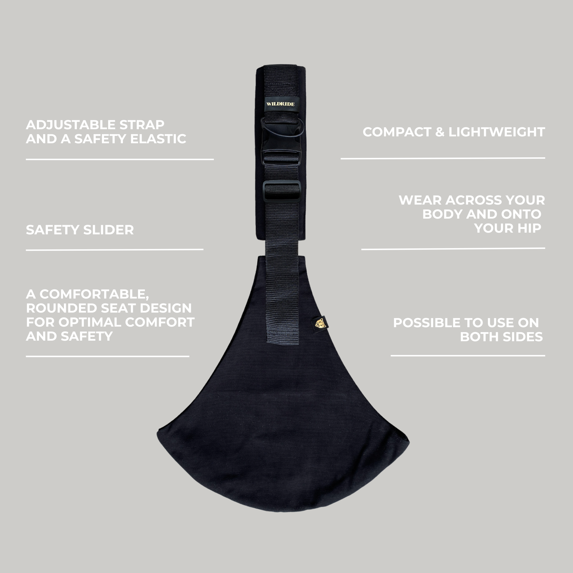 El portabebés Negro de Wildride es diseño holandés, combinando practicidad con un estilo atemporal. Di adiós al cochecito voluminoso y disfruta de la libertad con Wildride.