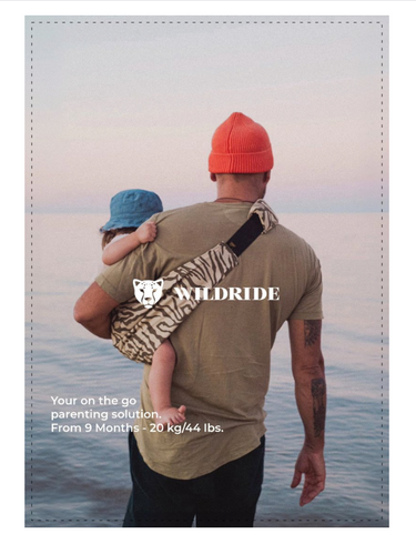 Flyer with summer scene showing a man carrying a child in the Wildride Toddler Carrier Zebra print, sea backdrop. Highlights include usage from 9 months up to 20 kg/44 lbs and the white Wildride logo.