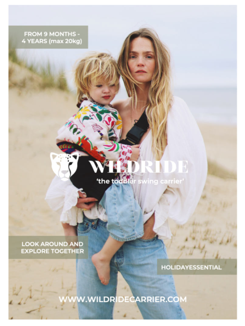 Foam board with lifestyle image, 50×70 cm, designed for in-store display of the Wildride Toddler Carrier.