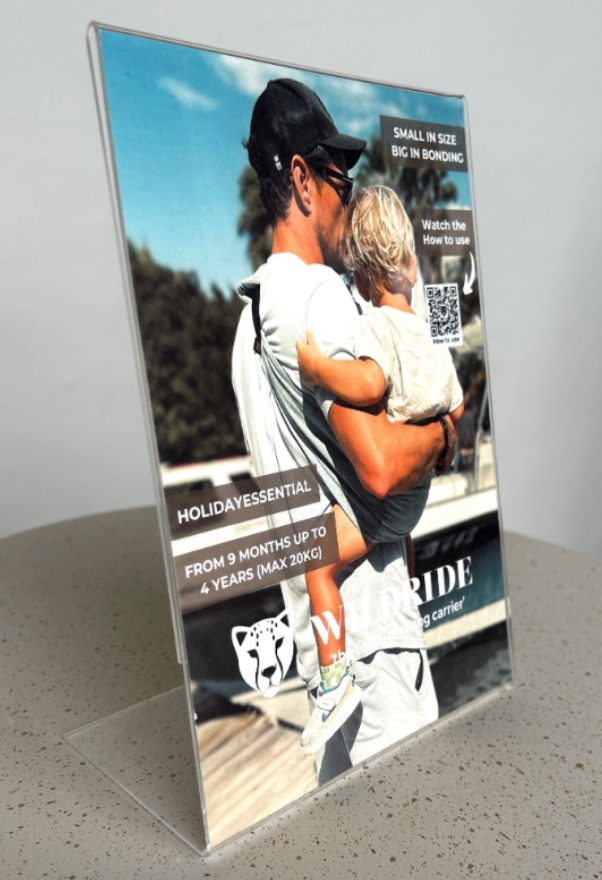 Transparent plastic flyer holder designed for in-store display of flyers.